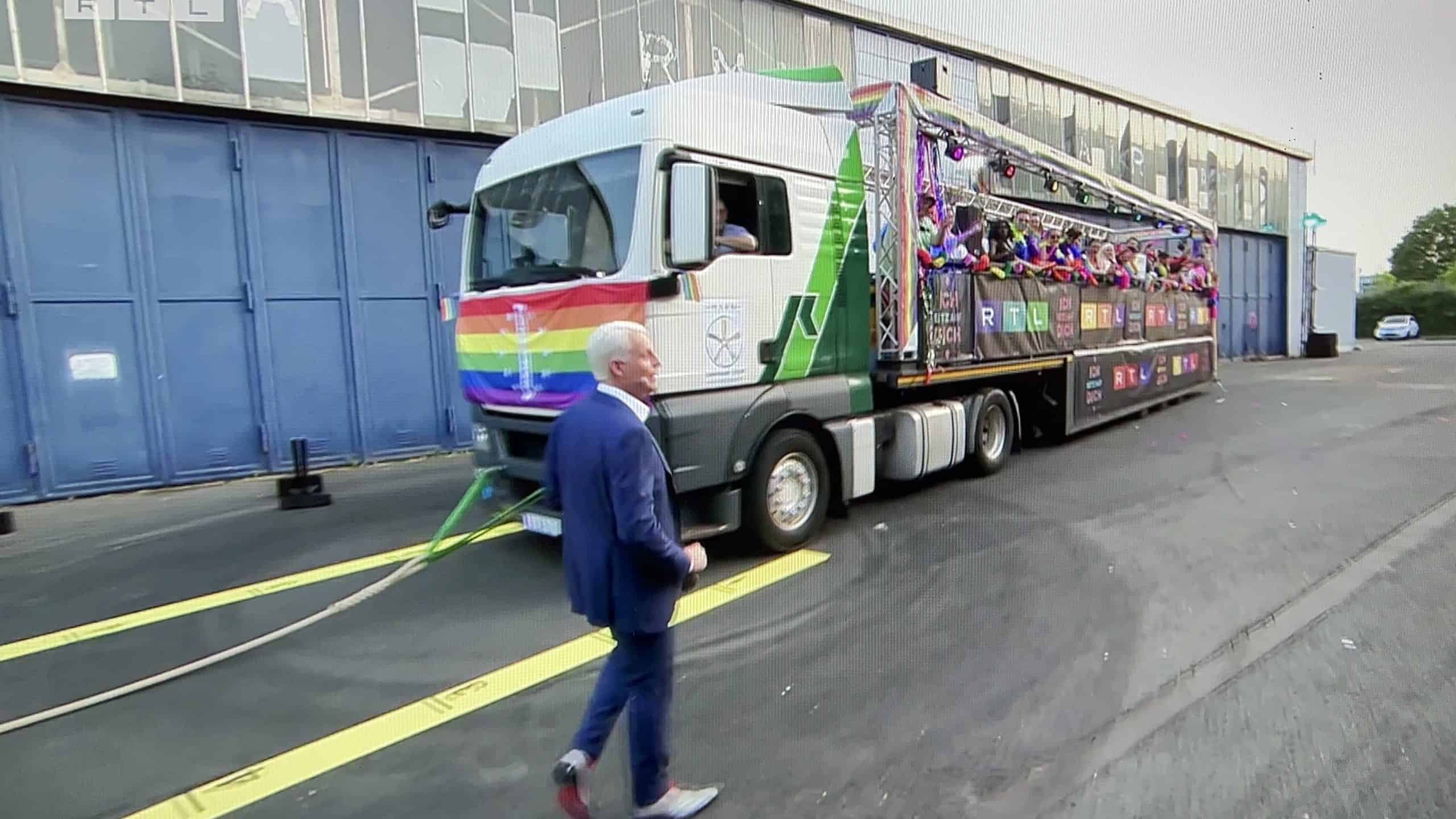 Eine Wette : Tobias zieht den CSD TRUCK , der heute in Köln beim CSD für Partystimmung sorgt, nur mit der Kraft seiner Arme 10 Meter .